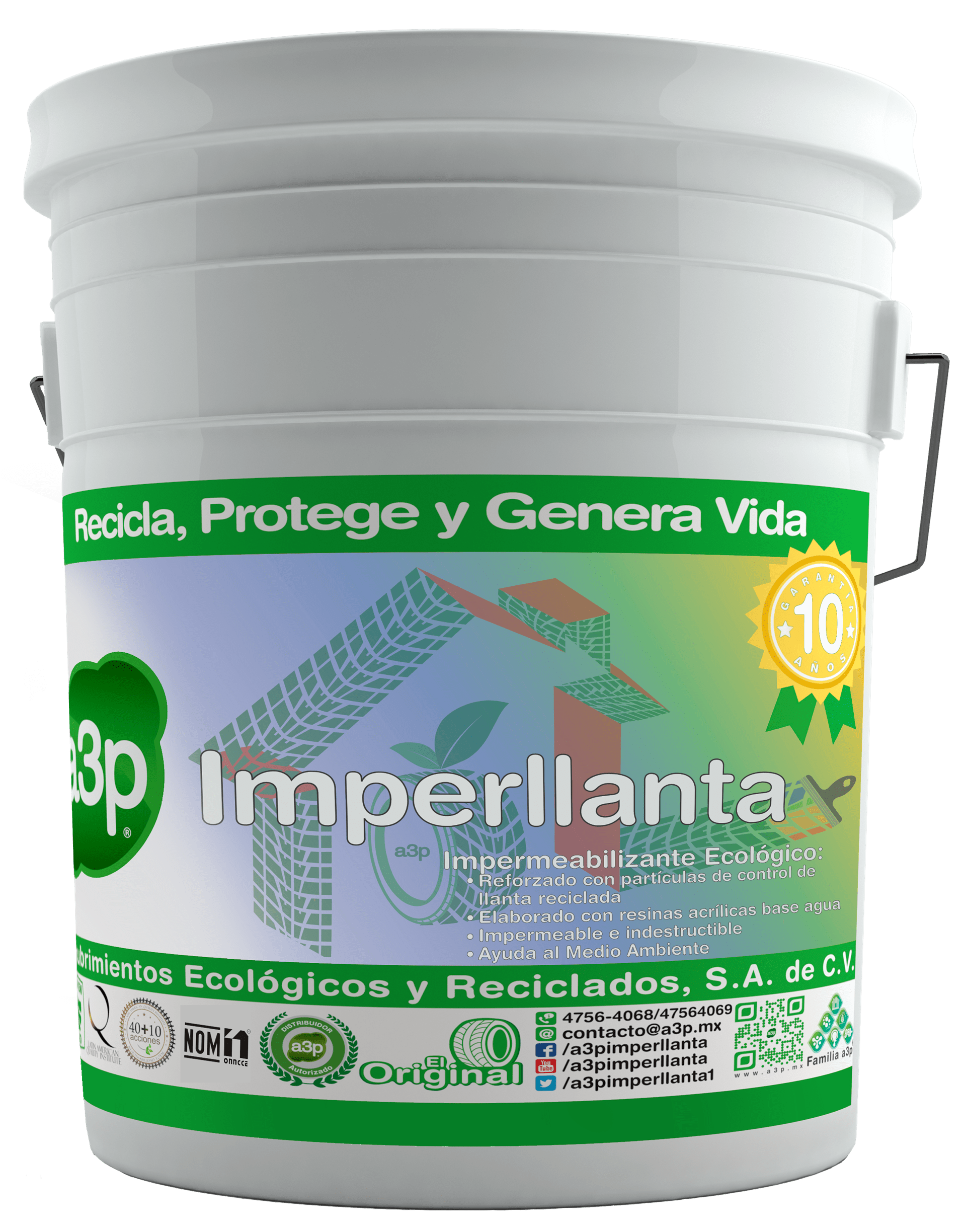 Imperllanta A3P es un impermeabilizante elaborado con resinas acrílicas, reforzado con partículas de llantas recicladas, con gran capacidad impermeable y resistencia al medio ambiente. Nuestro impermeabilizante ofrece una mayor durabilidad de 3 y 10 años. Es 100% ecológico al ser formulado a base de agua, ya que no contiene solventes orgánicos ni contaminantes tóxicos o dañinos para las personas o el medio ambiente.